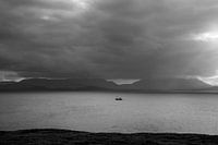 Een vissersboot vaart in Clew Bay, tussen county Mayo en county Galway. De zon schijnt even door de wolken, wat een mooi effect geeft op zee.