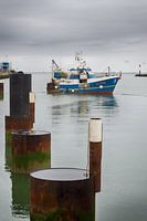 Een blauwe vissersboot in de haven van Ouistreham (Normandië, Frankrijk) is klaar om de zee op te gaan.