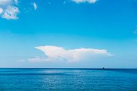 Vanaf de Malecon, de beroemde boulevard van Havana, Cuba, kijk je zo uit over de zee. In de verte zie je een vissersboot aan de Horizon. Ondanks dat er geen stralend blauwe hemel te zien was, kleurde de zee helder blauw. De wolk aan de horizon brengt het beeld alleen maar meer in evenwicht.