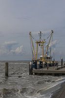 Vissersboot in de haven van Holwerd in Friesland. Tijdens een flinke wind ziet de zee er wat onstuimig uit.