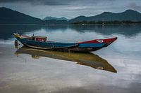 Roodblauwe vissersboot met een oog op de boeg op een bergmeer. Weerspiegeling in het water. Gemaakt in Lang Co, Vietnam.