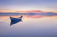 De Ria de Aveiro is een grote ondiepe lagune in het noorden van Portugal. De traditionele bootjes liggen hier van de lokale vissers. Bij zonsopkomst was het water heel rustig hier.
