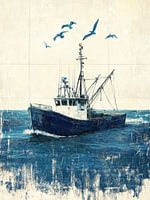 Een vissersboot trotseert de golven, vergezeld door meeuwen. De ruwe penseelstreken en het diepblauwe palet geven het werk karakter en rust tegelijk – perfect voor een maritieme sfeer aan de muur.
