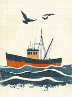 Een vissersboot trotseert de golven, vergezeld door meeuwen. De ruwe penseelstreken en het diepblauwe palet geven het werk karakter en rust tegelijk – perfect voor een maritieme sfeer aan de muur.