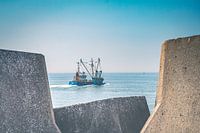 Een vissersboot verlaat de vaargeul naar open water aan de Oosteroever in Oostende. Ik gebruikte de stenen blokken van de Oostelijke strekdam om het schip te framen.