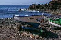 Aan zee ligt een vissersbootje op het eiland Lanzarote