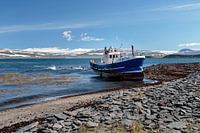 Dit 'gestrande' vissersbootje ligt aan de ruige kust tussen de imposante fjorden van de IJslandse Westfjorden.