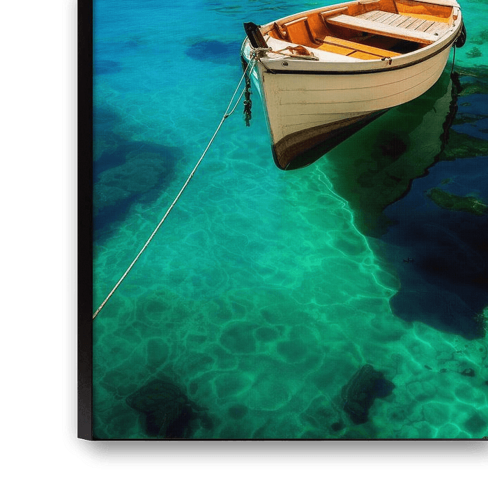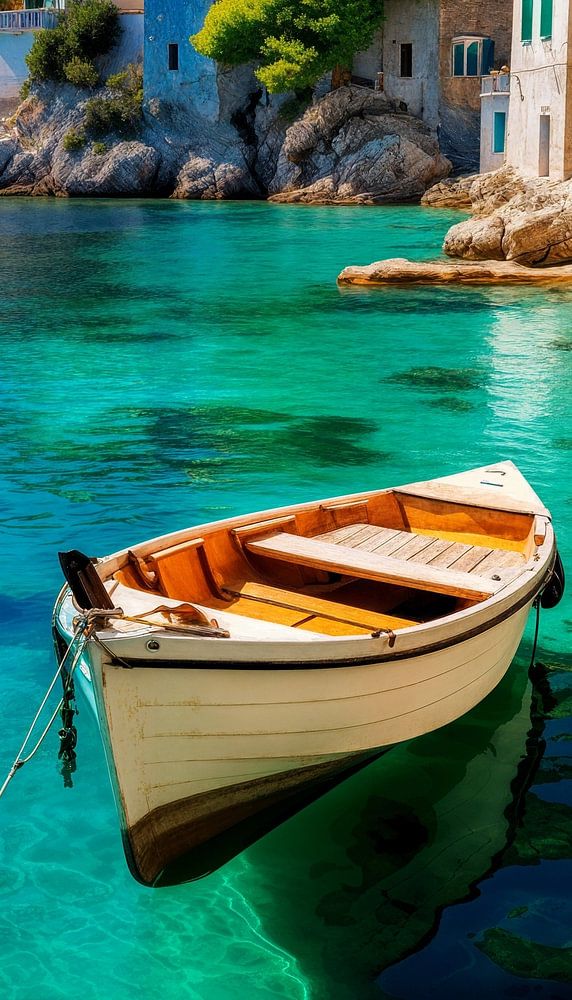 Deze afbeelding toont een boot die voor anker ligt in een Griekse baai met op de achtergrond een klein authentiek dorpje. Het turquoise water van de zee is zo helder dat je de bodem kunt zien. Boven de baai is de lucht strakblauw met een enkel wolkje.