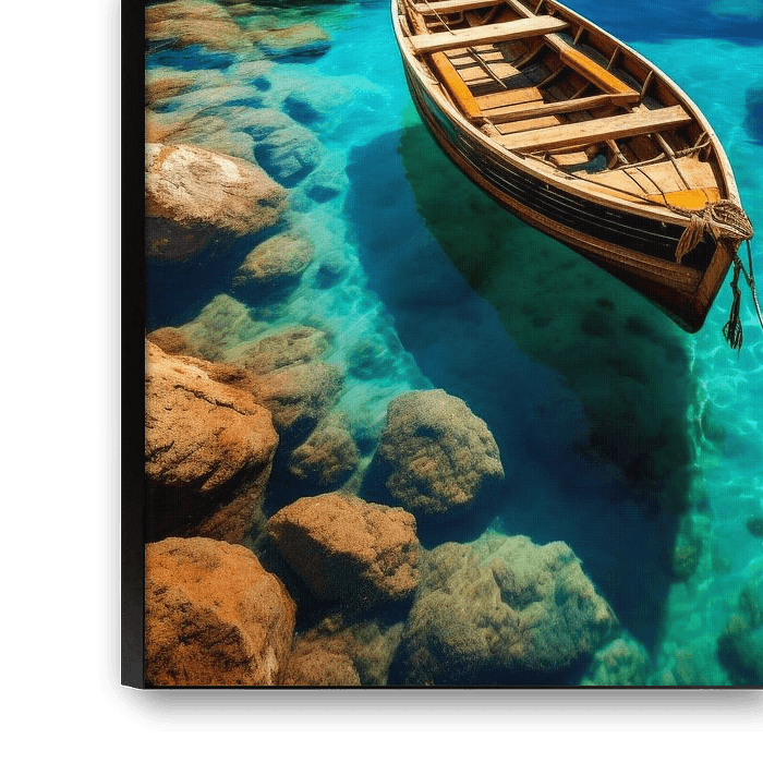Op deze afbeelding is een boot te zien die voor anker ligt in een heldere Griekse baai. Het turquoise water van de zee is zo helder dat de bodem zichtbaar is. Boven de baai is de lucht strakblauw met een enkel wolkje.