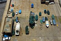 Blauwe vissersbootjes op de kade bij de haven van het vissersdorp Paul do Mar in Madeira, Portugal.