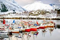 Vissersboten bij Sildpollneset in de Austnesfjorden in de winter in de Lofoten in Noord-Noorwegen met op de achtergrond besneeuwde bergen.
