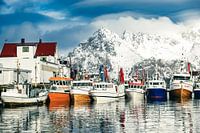 Vissersboten in de haven van Henningsvaer, een vissersdorp op een aantal kleine eilanden voor de zuidkust van Austvagoya in de Lofoten-archipel in Noorwegen.
