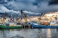 Vissersboten in de haven van Harlingen met een fraai verlichte wolkenlucht boven het Wad op de achtergrond tijdens zonsondergang.