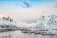Vissersboten in bij het Sildpollneset schiereiland in het Austnesfjord in de winter op de Lofoten in Noorwegen. Het is een mooie winterdag en de boten en de besneeuwde bergen worden weerspiegeld in het kalme water.