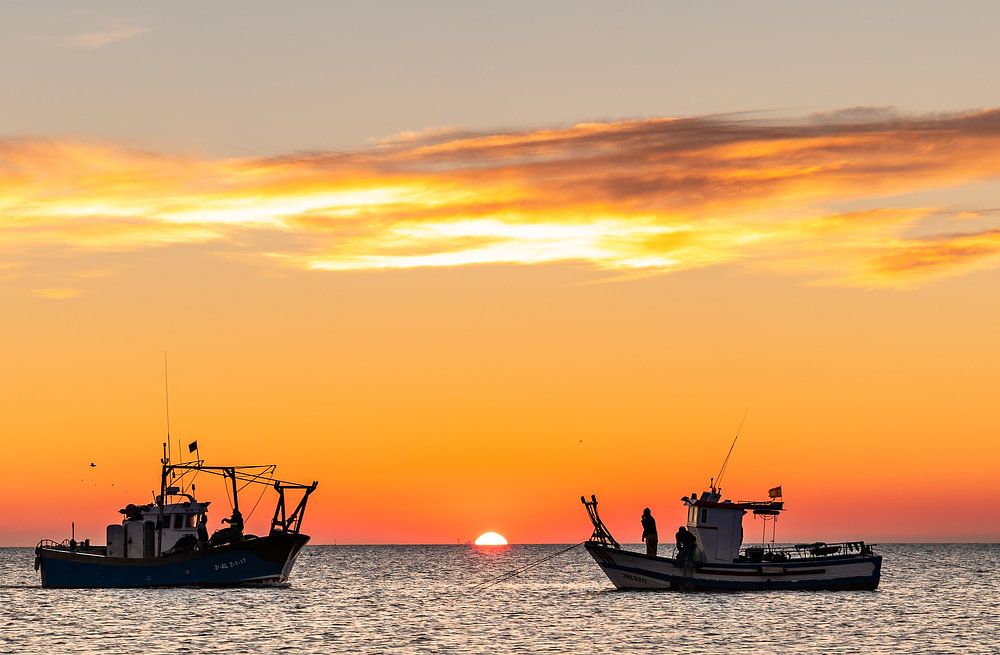twee vissersboten op de middellandse zee met opkomende zon in het ochtendrood