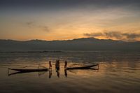 Vissersboten op het Inle meer in Myanmar bij zonsopkomst van Anges van der Logt