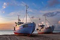 Vissersboten liggen in het avondlicht op het strand in Vorupor, Denemarken.