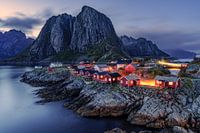 Het vissersdorp Hamnoy op de Lofoten (Noorwegen) is idyllisch gelegen aan de voet van de bergen in de Reinefjord. s Avonds gloeien de lichtjes van de oude vissershutten op, wat een idyllische omgeving creëert.