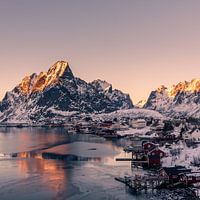 Vissersdorp Reine op de Lofoten-eilanden in Noorwegen in de winter met sneeuw bij zonsondergang