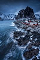 Lofoten in Noorwegen in Scandinavië op de poolcirkel. De rode huizen van het stadje Hamnoy tegenover een prachtig berg- en rotslandschap. Midden tussen bergen en fjorden ligt dit idyllische plaatsje met zijn roodgeverfde houten huisjes. De Atlantische Oceaan is niet ver weg en dus is de zee hier vaak erg onrustig, zoals je kunt zien aan de vele kleine schuimkoppen en de nevel wanneer de golven de rotsen raken. Portret / portretfoto. 230028ays