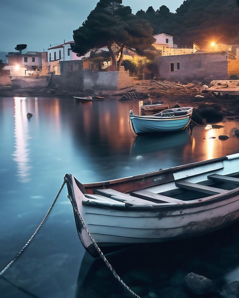 Romantische sfeer in de avond in een klein vissersdorpje in Italië, boot op de voorgrond