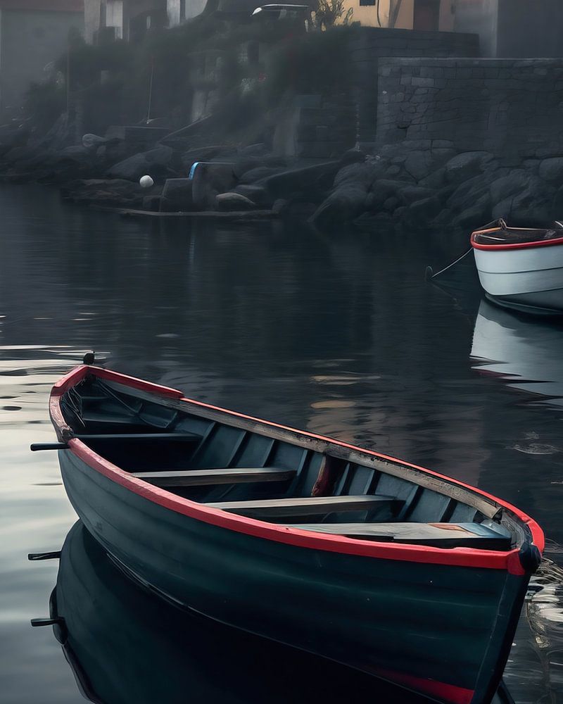 Vissersdorp in Italië in de mist met boten op de voorgrond