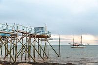 Vissershuis met Vissersboot in de regio van Bordeaux in Frankrijk. Een interessant lijnenspel van palen en de rust van een zeilschip dat ter anker ligt.