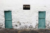 Dit oude vissershuis met scheve, verzakte deuren zoekt een koper om de boel op te knappen. Op de verweerde gevel (geveltje) een bord met tekst 'For Sale' en 'Se Vende". Een vervallen en verlaten cottage annex ruïne te koop, een opknappertje. Lanzarote, Spanje. Urbex, verval, degeneratie, kapot, verwering, verwaarloosd.