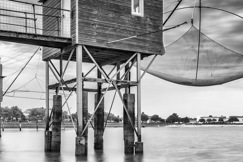 Zwart-wit foto van authentieke visserhuisjes in Saint Nazaire, Bretagne Frankrijk.