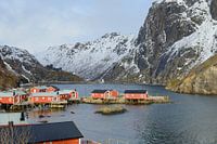 Typisch Noorse vissershutten op de rotsen in het dorpje Nusfjord op de Lofoten in Noorwegen. Het vissersdorp ligt versholen in een Fjord waarvan de wanden bedenkt zijn met sneeuw tijdens deze winterse dag.