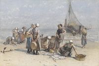 Door bomschuiten aangevoerde vis werd op het strand van Scheveningen gesorteerd en geveild. Vissersvrouwen brachten grote manden mee om die met verse vis te vullen en ze te verkopen in de stad. Deze aquarel is niet afkomstig uit de collectie Drucker-Fraser, maar uit het legaat van jhr.mr. P.A. van den Velden uit 1892. Het legaat vormde de basis van de 19de-eeuwse tekeningen- en aquarellencollectie van het Rijksmuseum.