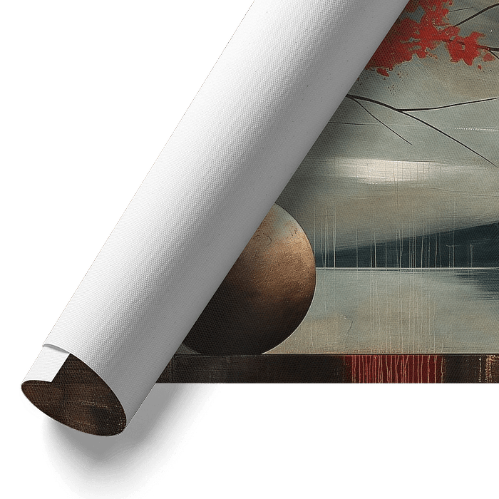 Abstract landschap in Japandi stijl met een vaas met rode bloesem en een volle maan boven bergen en zee op de achtergrond.