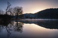 Ochtendhumeur bij een visvijver in het Bergisches Land bij Lindlar, Duitsland