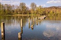Gedeeltelijk vervallen steiger in de visvijver van Valkenburg