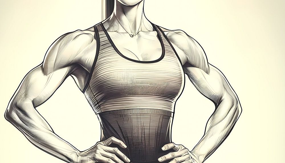 Het kunstwerk "Vitaliteit in Beweging" toont een portret van een atletische vrouw, een visuele ode aan kracht en vitaliteit. Ze is fit en zelfverzekerd, haar handen rustend op haar heupen, in sportieve kleding die haar afgetrainde lichaam en gezonde fysiek benadrukt. De hoge paardenstaart vangt niet alleen de essentie van beweging en energie, maar weerspiegelt ook de dynamische geest van haar actieve levensstijl.