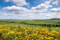 Prachtig uitzicht over een stukje van de Champagne-regio in Frankrijk. Met kleurrijke bloemen in de voorgrond en heerlijke wolkenlucht.