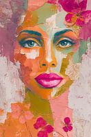 In Vivid Bloom Portrait smelten collagekunst en schilderachtige texturen samen tot een gelaagd, levendig portret. Het gezicht verschijnt vanuit gescheurde verf- en papierranden, opgebouwd uit tinten fuchsia, koraal, perzik, oker en zacht mintgroen. De intense blik en volle, glanzende…