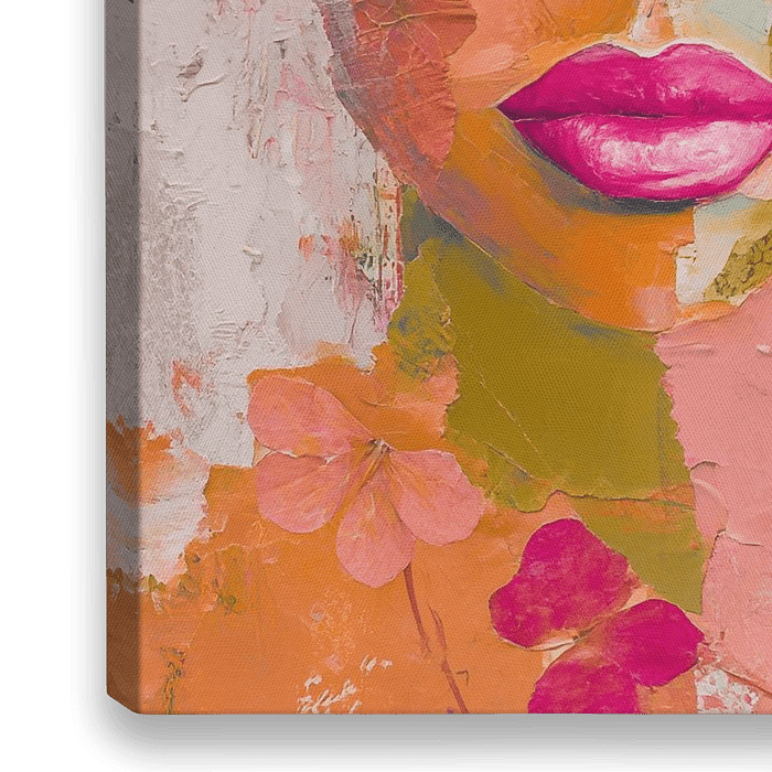 In Vivid Bloom Portrait smelten collagekunst en schilderachtige texturen samen tot een gelaagd, levendig portret. Het gezicht verschijnt vanuit gescheurde verf- en papierranden, opgebouwd uit tinten fuchsia, koraal, perzik, oker en zacht mintgroen. De intense blik en volle, glanzende…