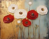 De kunstzinnige weergave van de bloemen met een dikke, bijna sculpturale textuur van de verf, geeft het geheel een driedimensionaal effect.