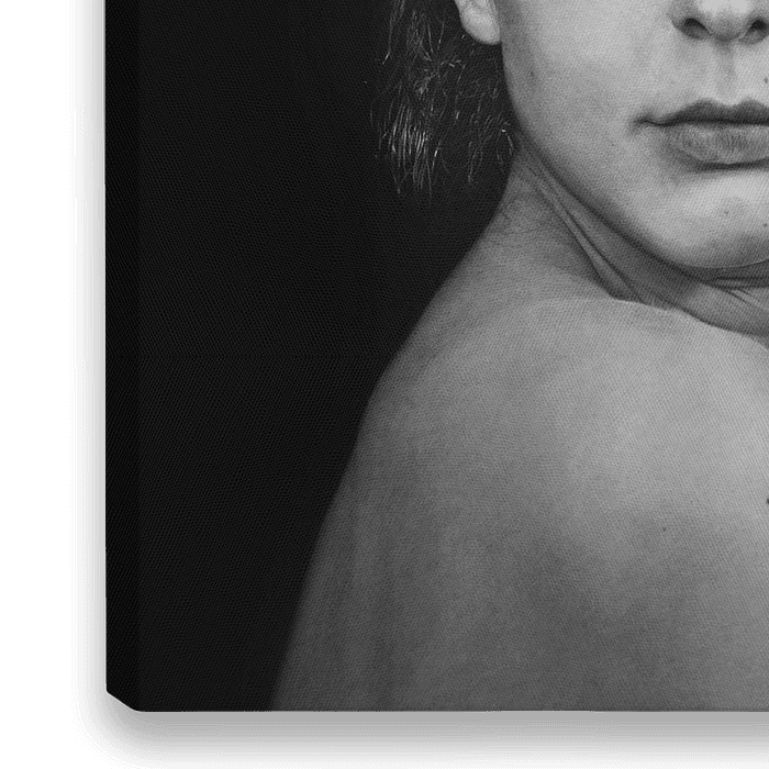 Betreft een hyperrealistische houtskooltekening op wit papier.