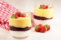 Dessert van yoghurt, vanillevla en aardbeien in een coupe