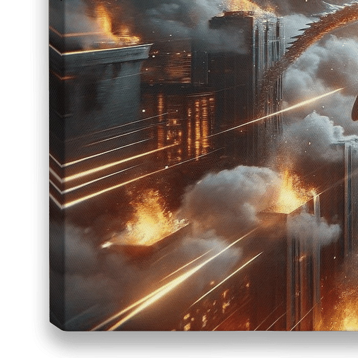 Koop dit digital art kunstwerk Vlammende drakenrijder boven de stad van artefacti als reproductie op canvas, aluminium dibond, (ingelijste) fotoprint, behang en ArtFrame, op maat geprint in Fine-Art kwaliteit.