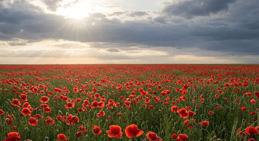 Dit adembenemende muurkunstmotief toont een eindeloos veld van felrode klaprozen die zich als een levend tapijt uitstrekken tot aan de horizon. Donkere, dramatische wolken spreiden zich uit over het panorama en creëren een intense, mystieke sfeer. Gouden zonnestralen dringen door een onderbreking van het wolkendek, verlichten het rijke rood van de bloemen en creëren een fascinerend contrast tussen licht en duisternis.
