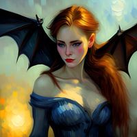 De titel, "Vleermuisengel," roept een gevoel van contrast op. De vrouw lijkt te zweven tussen twee werelden, waarbij haar vleermuisvleugels zowel duister als majestueus zijn. Het kunstwerk roept vragen op over de aard van engelen en demonen, en daagt de kijker uit om na te denken over de betekenis van schoonheid in de duisternis.