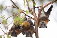 Drie vleermuizen op een rij met hun blik op de fotograaf gericht. Overdag hangen ze ondersteboven om in de avond en nacht actief te worden. Ze vliegen dan van Tyalgum naar Byron Bay voor hun voedsel en weer terug. Geweldig schouwspel om ze bezig te zien en te horen.