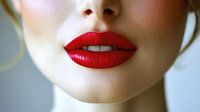 Deze close-up van perfecte rode lippen benadrukt het sensuele charisma en de modieuze glamour van een vrouw. De levendige lippenstift geeft haar lippen een sterke expressiviteit en symboliseert passie, zelfvertrouwen en jeugdigheid. De stralende, vlekkeloze finish van de lippenstift benadrukt haar elegantie en benadrukt haar natuurlijke schoonheid. Dit beeld vangt de essentie van mode en sensualiteit en brengt een gevoel van kracht en glamour over, dat wordt versterkt door het heldere en levendige beeld.