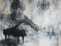 Vleugelpiano | Elegante Piano op Grijstinten - Dit pianoschilderij toont een majestueuze zwarte vleugelpiano op een bevlekte trap, tegen een ruw, rokerig grijszwart achtergrond met een elegante ijzeren trapleuning en sierlijke, donkere kroonluchters, wat een gevoel van oude glorie en mysterie oproept in een moderne…