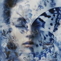 Afbeelding van een vervaagde vrouw met gesloten ogen. Vlinders vermengd met haar gezicht en voor haar gezicht symboliseren de vleugels van haar ziel. Is het de vrijheid waarnaar ze verlangt? Zijn het de vleugels die haar letterlijk de mogelijkheid geven om te gaan vliegen en haar dromen waar te maken? Mooie serene afbeelding vol fantasie en mogelijkheden uitgevoerd in blauw en wit. Met een twist naar Delfts Blauw. Passend bij diverse trends en stijlen, zoals fantasie, modern abstract. Artiest: Bianca ter Riet