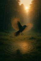 Een vogel zweeft sierlijk boven een spiegelend wateroppervlak, gevangen in het zachte ochtendlicht dat door het bos filtert. De lichtval op de vleugels en de gouden gloed creëren een betoverende, haast magische sfeer.