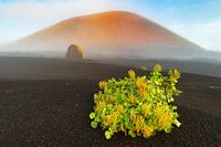 Bij zonsopgang komt een oogverblindende zonsopgang op boven de fascinerende Caldera Colorada in het Parque Natural de Los Volcanes op Lanzarote, een van de betoverende Canarische eilanden. Het landschap wordt gekenmerkt door een betoverende poëzie die de zintuigen raakt en de ziel doet vliegen.
